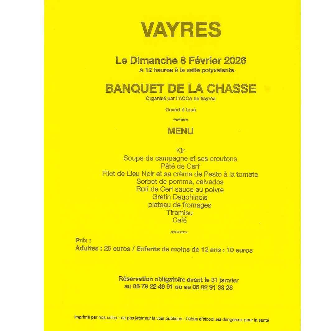 Le Banquet de la chasse aura lieu dimanche 8 février à la salle polyvalente à midi.